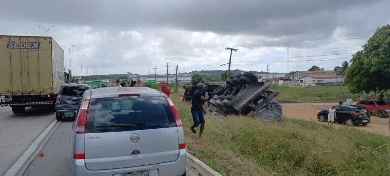 Uma colisão, seguida de tombamento de caminhão, foi registrada na manhã desta quinta-feira (8), em um trecho da BR-101 na Paraíba. O fato ocorreu no trecho da rodovia que corta o município de Alhandra, Litoral Sul do estado.