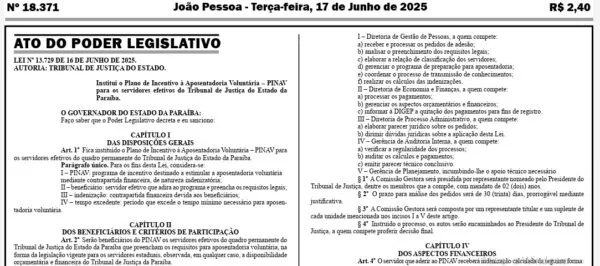 O governador da Paraíba, João Azevêdo (PSB) sancionou o Plano de Incentivo à Aposentadoria Voluntária (PINAV) para os servidores efetivos do Tribunal de Justiça do Estado da Paraíba (TJPB).
