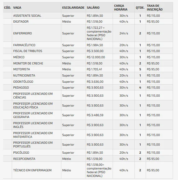 Conforme prevê o edital, haverá provas escritas, práticas e de títulos,segundo as especificidades de cada função. As oportunidades contemplam diferentes áreas e níveis de escolaridade. O menor salário inicial é de R$ 1.518,00 para os cargos de recepcionista, monitor de creche e recepcionista. Confira quadro de vagas e salários: