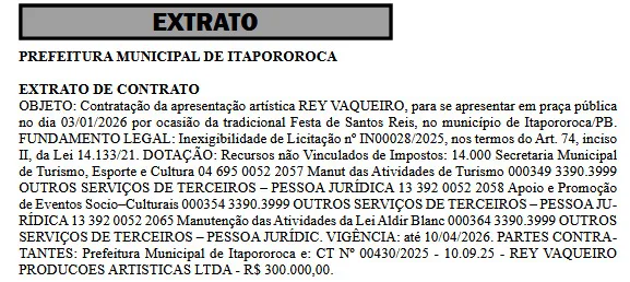 Um município na Paraíba fechou recentemente um contrato de R$ 300 mil para um show de Rey Vaqueiro. Conforme apurou a reportagem, trata-se de Itapororoca, na região do Vale do Mamanguape. A informação consta em extrato de contrato publicado na edição deste sábado (4) do Diário Oficial do Estado (DOE).