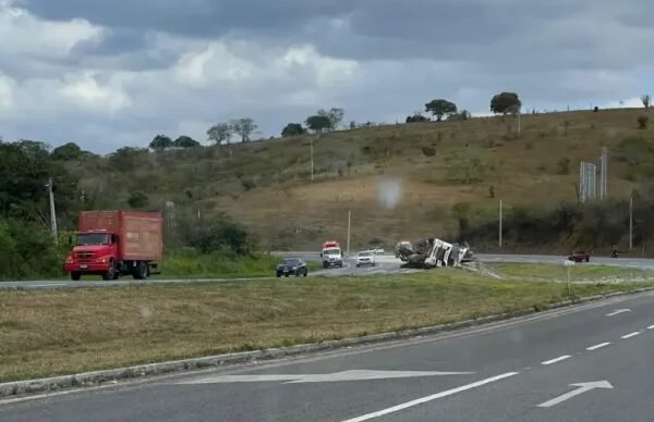 Apesar do impacto do capotamento, o motorista do veículo não ficou ferido. Os sacos de cimento, porém, ficaram espalhados pela rodovia.