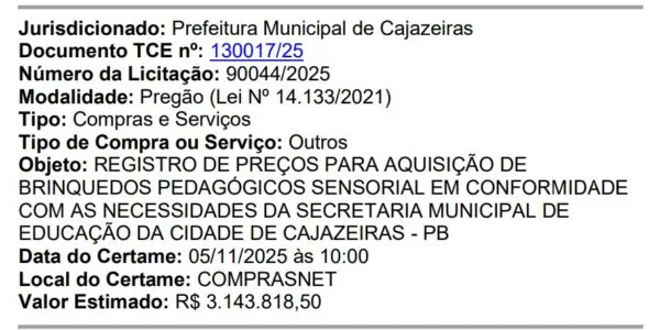 A Prefeitura Municipal da cidade de Cajazeiras lançou um edital no valor de mais de R$ 3 milhões para comprar de brinquedos pedagógicos. A licitação ocorrerá no site Compras Net.
