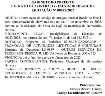 A Prefeitura de Bernardino Batista desembolsou R$ 440 mil em shows do cantor Mano walter e da Banda Bonde do Brasil. Extratos de contrato foram publicados no Diário Oficial dos Municípios desta segunda-feira (20).