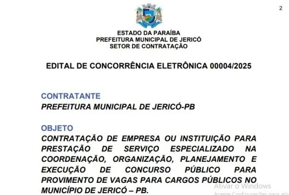 A sessão pública ocorrerá às 9 horas do dia 5 de dezembro de 2025 (horário de Brasília). O objeto da presente é a contratação de empresa ou instituição para prestação de serviço especializado na coordenação, organização, planejamento e execução de concurso público em Jericó para provimento de vagas para cargos públicos conforme condições, quantidades e exigências estabelecidas neste edital e seus anexos.