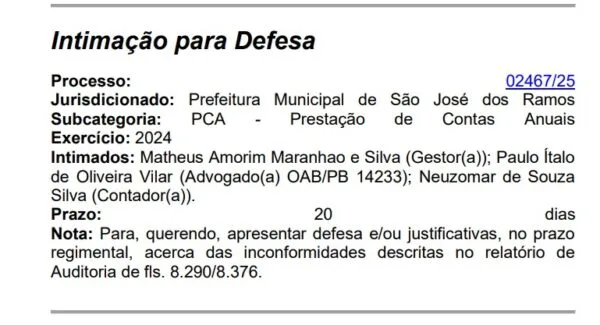 O Tribunal de Contas do Estado da Paraíba (TCE-PB) intimou o prefeito de São José dos Ramos, Matheus Amorim Maranhão e Silva para explicar possível favorecimento de agentes públicos e irregularidades na locação de veículos.