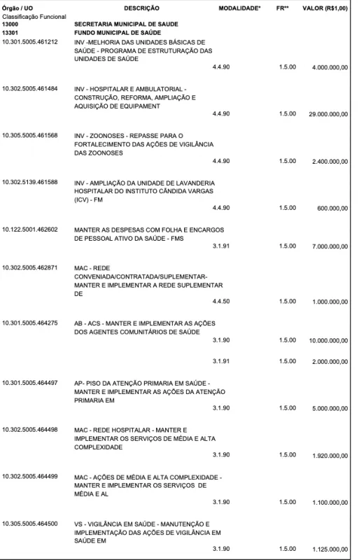 Segundo o projeto, os recursos serão retirados de investimentos como melhoria das Unidades Básicas de Saúde, repasses para serviços de zoonozes, implantação de lavandaria no Instituto Cândida Vargas e outras ações previstas para serem realizadas no Sistema de Saúde. (veja a tabela no final da matéria)