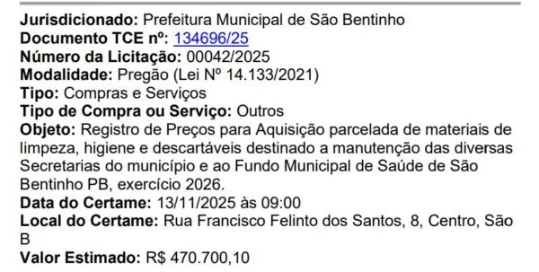 A Prefeitura Municipal de São Bentinho lançou a Licitação 00042/2025, na modalidade pregão (Lei Nº 14.133/2021), do tipo compras e serviços. O objetivo é realizar o registro de preços para aquisição parcelada de materiais de limpeza, higiene e descartáveis destinado à manutenção das diversas secretarias do município e ao Fundo Municipal de Saúde no exercício 2026. O valor estimado é de R$ 470.700,10.