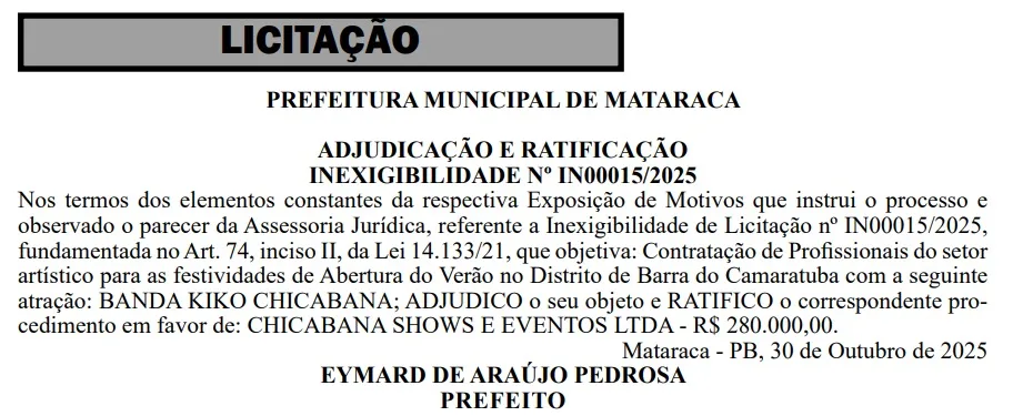 “Contratação de profissionais do setor artístico para as festividades de Abertura do Verão no Distrito de Barra do Camaratuba com a seguinte atração: BANDA KIKO CHICABANA; ADJUDICO o seu objeto e RATIFICO o correspondente procedimento em favor de: CHICABANA SHOWS E EVENTOS LTDA – R$ 280.000,00”, diz o termo de adjudicação e ratificação da licitação.