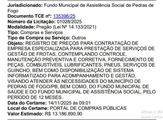 O Fundo Municipal de Assistência Social de Pedras de Fogo, órgão ligado a Prefeitura, lançou um edital de edital licitação com valor estimado de R$ 13.186.890,90. O objetivo é o registro de preços para contratação de uma empresa especializada para prestação de serviços de gestão de frotas.