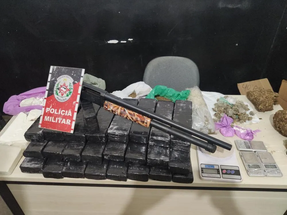 Além da arma, de calibre 12, foram apreendidas drogas dos tipos maconha (12,3kg), skank (1,3kg) e cocaína (1,3kg).