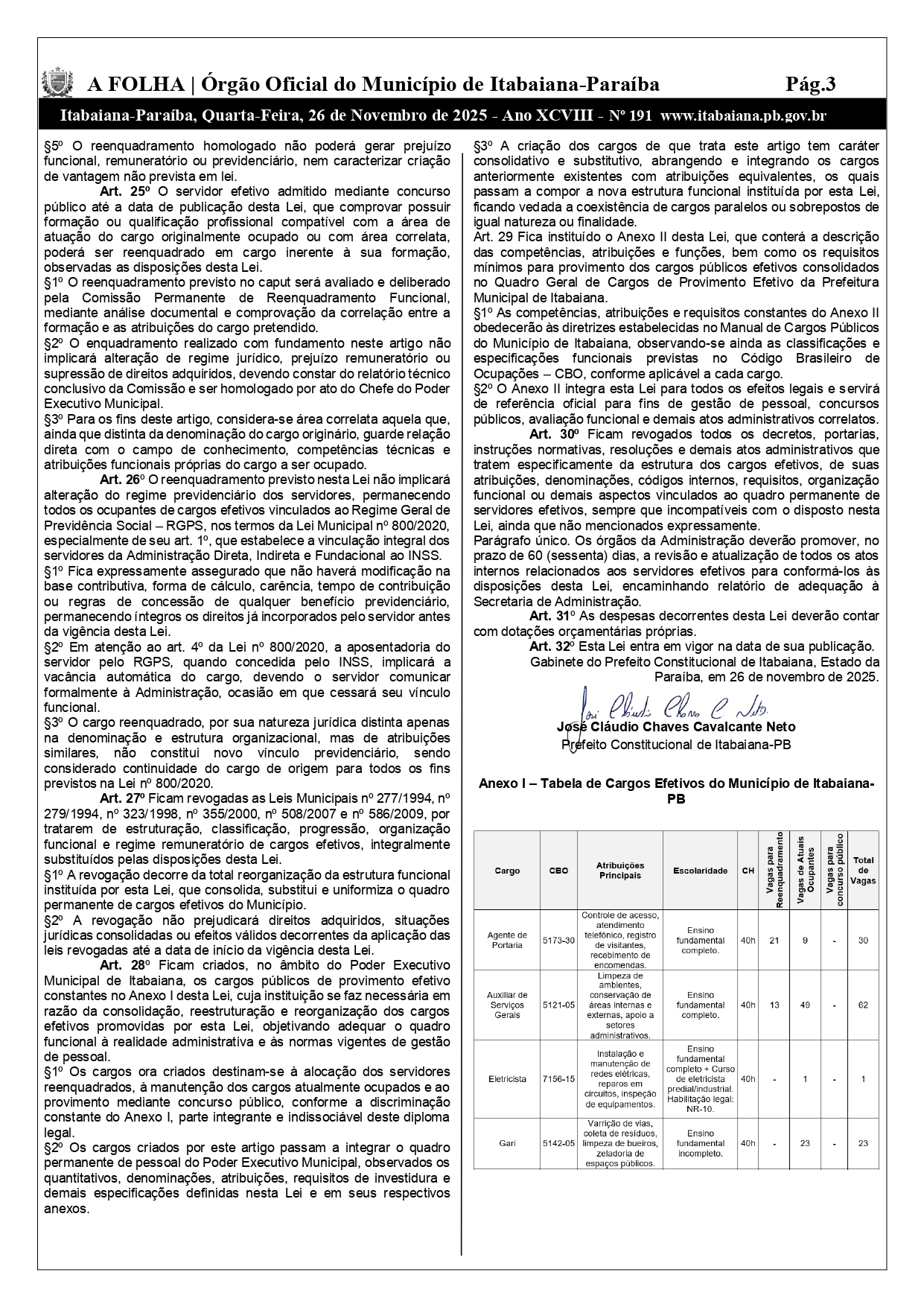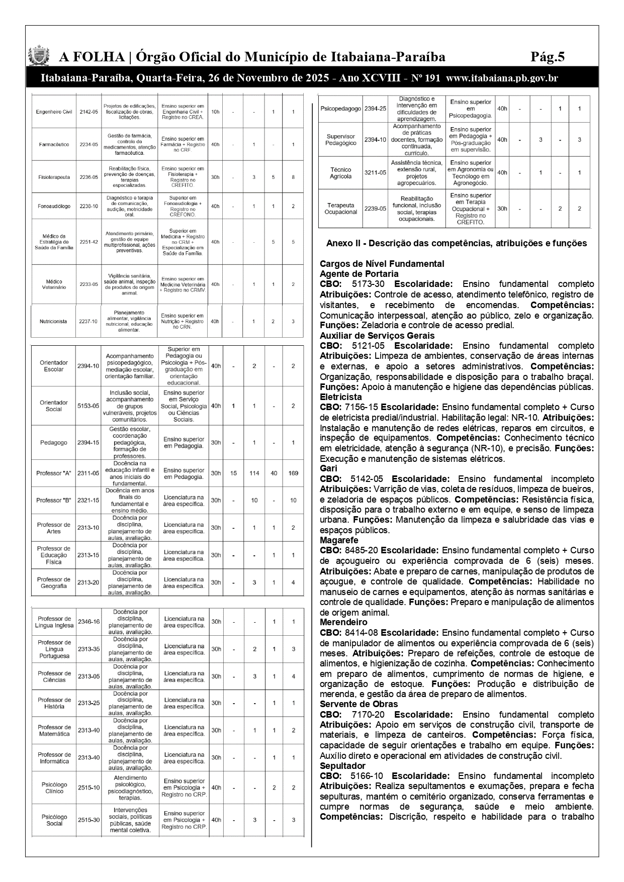 A reportagem verificou que o quadro total de vagas previstas no concurso da Prefeitura Municipal de Itabaiana consta na lei Nº 950/2025, enviada pelo poder Executivo à Câmara e aprovada pela casa Dr. Antônio Batista Santiago.