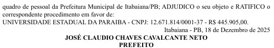 A Prefeitura Municipal de Itabaiana, na região do Vale do rio Paraíba, deve lançar nas próximas semanas, edital de um novo concurso público com 126 vagas. A banca contratada para a realização das provas foi a Comissão Especial de Concursos da Universidade Estadual da Paraíba (CPcon-UEPB), no valor de R$ 445.905,00, segundo consta em publicação no Diário Oficial do Estado (DOE) do dia 19 de dezembro. A contratação da banca ocorreu por meio de dispensa de licitação.