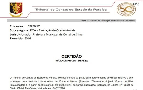 O Tribunal de Contas do Estado da Paraíba (TCE-PB) deu início ao prazo para apresentação de defesa para o prefeito da cidade de Curral de Cima, Adjamir Souza da Silva, referente ao não ressarcimento de mais R$ 119 mil do Fundeb. A Assessora Técnica, Noêmia Lisboa Alves da Fonseca Maciel também foi intimada.