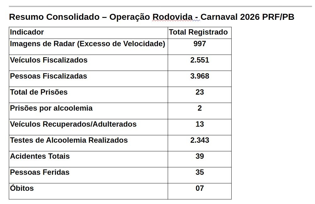 Polícia Rodoviária Federal (PRF) divulgou, nesta quarta-feira (19), o balanço da Operação Rodovida – Carnaval 2026 na Paraíba. Para corporação, o levantamento acende um alerta. Nesse período, sete pessoas morreram e quase mil motoristas foram flagrados em excesso de velocidade.