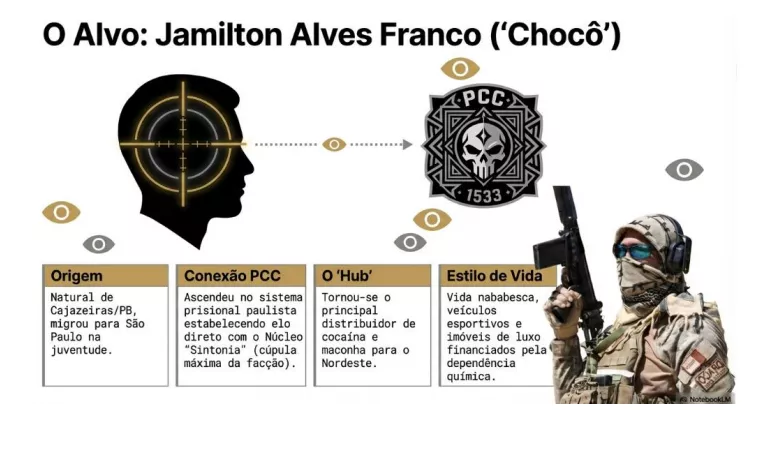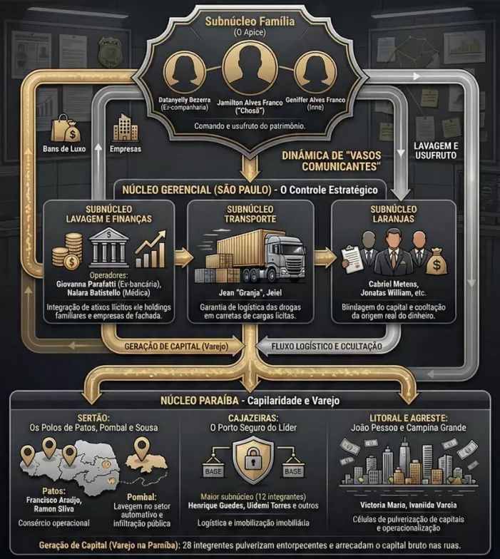 As investigações apontam como líder da organização criminosa Jamilton Alves Franco, conhecido como “Chocô”, natural de Cajazeiras (PB), mas radicado em São Paulo desde a juventude. Segundo a Polícia Civil, ele ascendeu dentro do sistema prisional paulista e estabeleceu conexões diretas com o núcleo “Sintonia” do Primeiro Comando da Capital (PCC), considerado o centro decisório da facção.