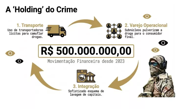 O núcleo financeiro operava um esquema sofisticado de lavagem de dinheiro, com movimentação estimada em cerca de R$ 500 milhões desde 2023.