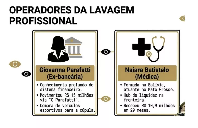 - Naiara Batistelo: Médica formada na Bolívia e atuante no Mato Grosso. Atuava como um “hub” de liquidez na fronteira, recebendo mais de R$ 10,9 milhões em 29 meses. A suspeita é que seu histórico acadêmico na Bolívia facilitou sua cooptação como “laranja financeira” no comércio transfronteiriço de cocaína.