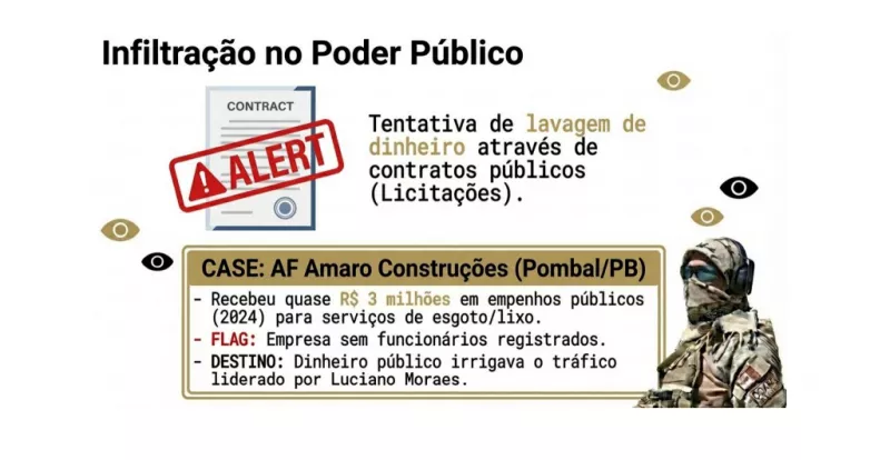 - AF Amaro Construções (Pombal/PB): Recebeu quase R$ 3 milhões em empenhos públicos em 2024 para serviços de esgoto e lixo, sem possuir funcionários registrados. O dinheiro público era usado para irrigar o tráfico de drogas liderado por Luciano Moraes, preso na manhã desta quinta-feira (26), em Pombal.