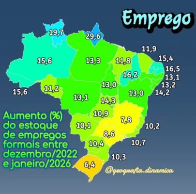 Nesta semana o Cadastro Geral de Empregados e Desempregados (CAGED), divulgou dados de um levantamento relativo ao estoque de empregos formais (número total de vínculos de trabalho ativos com carteira assinada) entre dezembro de 2022 e janeiro de 2026.