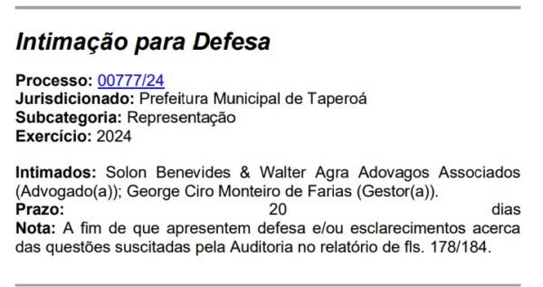Tribunal de Contas do Estado da Paraíba (TCE-PB) deu ao Prefeito de TaperoáGeorge Ciro Monteiro de Farias, o prazo até 16 de abril de 2026 para apresentar defesa sobre irregularidades envolvendo a construção de uma creche municipal.