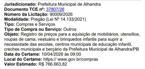 A Prefeitura Municipal de Alhandra lançou a Licitação 90009/2026, na modalidade Pregão para o “registro de preços para a aquisição de mobiliários, utensílios, roupas de cama, vestuário e brinquedos infantis para suprir a necessidade das escolas, centros municipais de educação infantil, creches municipais e berçário da Prefeitura Municipal.