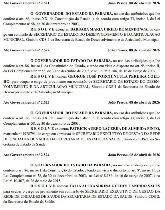 Em ato governamental, Lucas Ribeiro exonerou Barbara Maria Cirilo de Mendonça do cargo de secretária de Estado do Desenvolvimento e da Articulação Municipal. No lugar dela assume George José Porciúncula Pereira Coelho.